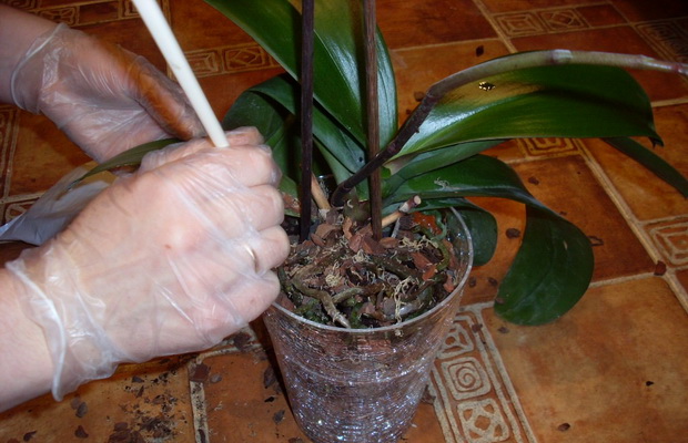 - En gryte med en blomst plasseres i et basseng med en løsning og helles over orkideen ovenfra og prøver å ikke falle på knoppene og i bladakslene;