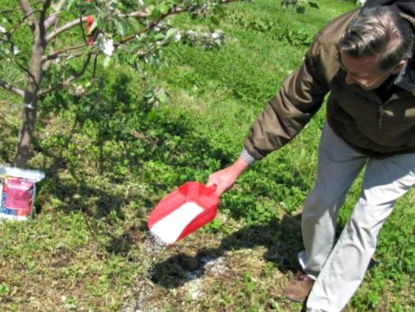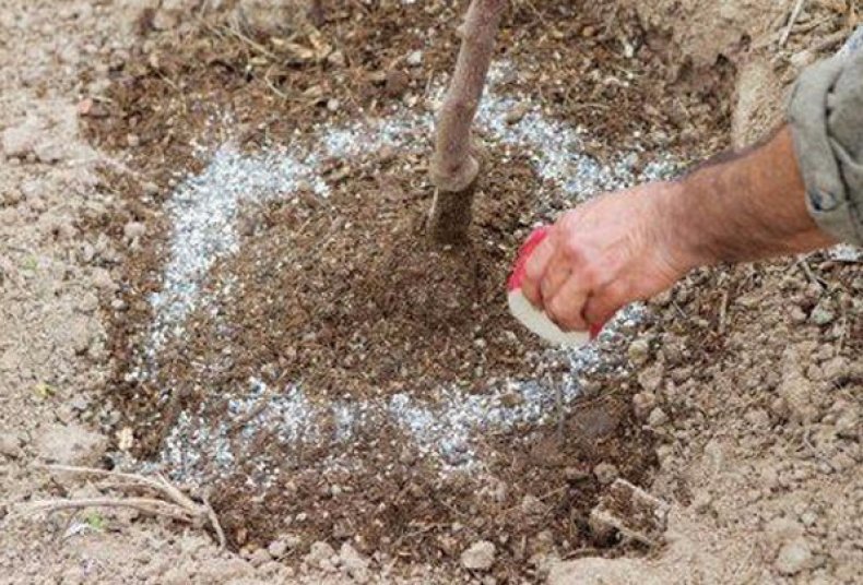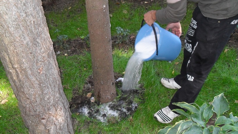 Først bør du grave et grunt spor i den nærmeste tønnsirkelen. Deretter helles løsningen forsiktig i den. Etter det skal sporet dekkes med jord. Det anbefales å utføre toppdressing i solrikt, rolig vær.