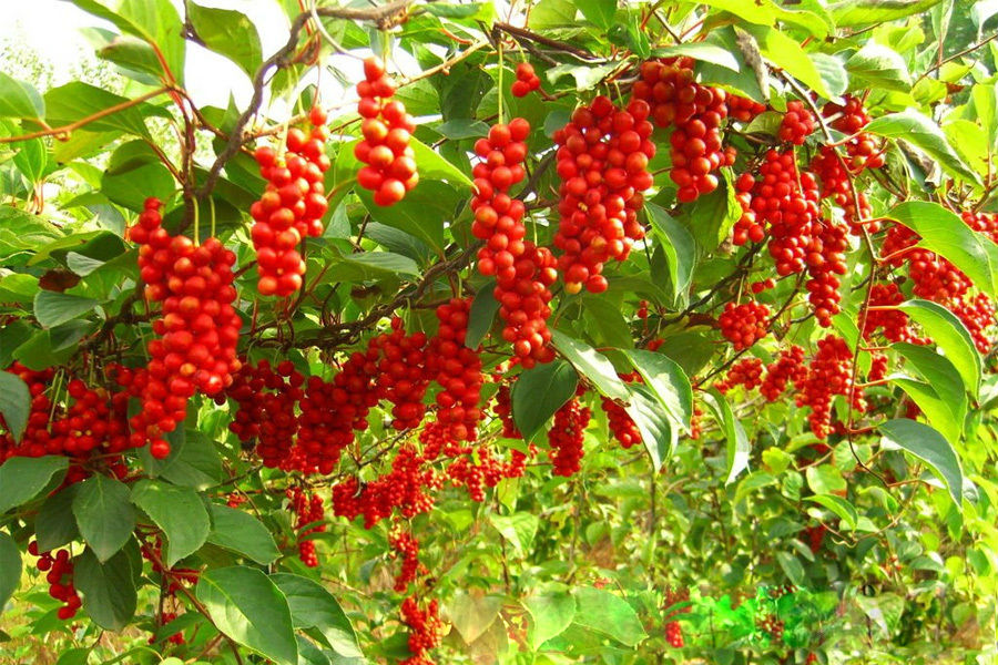 Blomstene er hvite. Bærene vokser i bunter, som druebunter, men de er mindre i størrelse. Når de er helt modne, blir de røde og myke. Innhøstingen modnes i september. Når høstes, brytes sitrongressvintreet i bunter. De resterende stilkene og kvistene fra børstene kan brukes til å lage te. Vanligvis modnes en særlig stor innhøsting hvert 2-3 år, så hviler planten en stund.