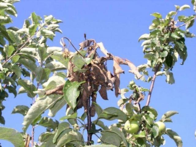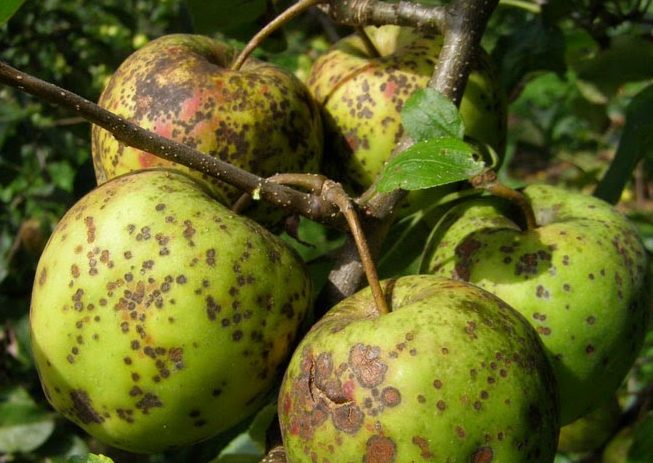 Den vanligste og farligste soppsykdommen hos frukttrær, spesielt epler og pærer. Infeksjon skjer gjennom nyrene og sprer seg over hele overflaten av treet.Sykdommen kan gjenkjennes ved en grønnbrun blomst som sprer seg fra blader til frukt.