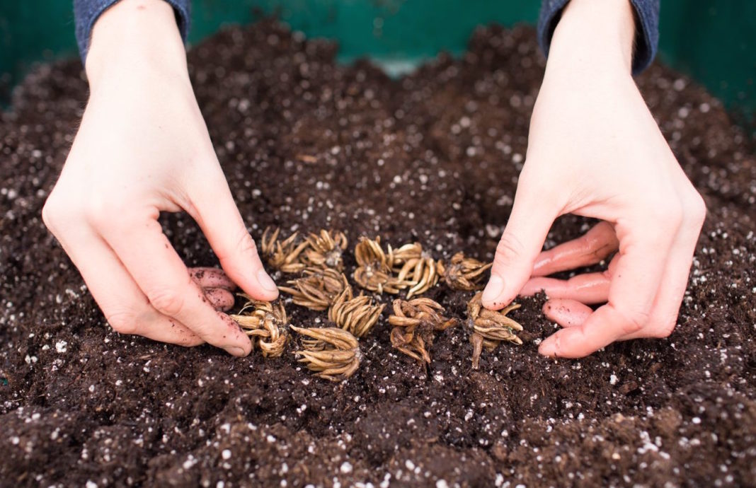 Hjemme plantes flere knuter samtidig i en bred gryte. De holdes i vann i en dag. Drenering legges på bunnen: utvidet leire, eggeskall, pukk. Tilsett deretter et lag med fruktbar jord, knoller, som er drysset med jord. Det er nødvendig å vanne og overvåke temperaturen, som ikke skal overstige +12 ° C. Du må jevnlig fukte bakken.