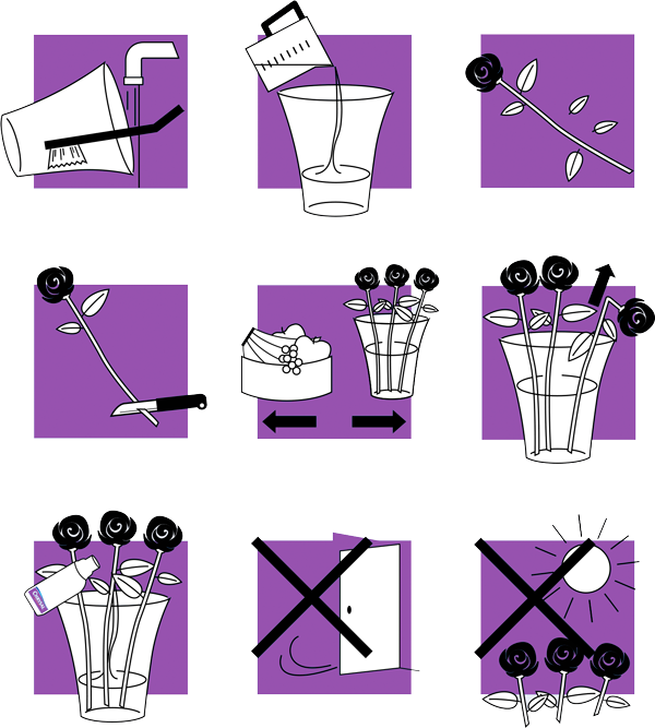 - fjerne blader fra blomsten som ligger under væskenivået for å unngå rask vannforurensning;