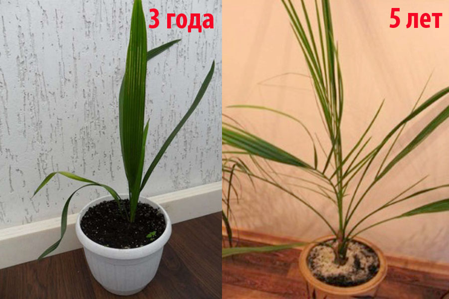 Palmskudd ligner gress, bare bladene er tøffere. Slik vil hun se ut til omtrent 3 år gammel. Så begynner treet å få et kjent blikk.