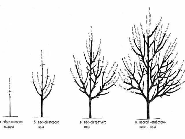 Plommekronedannelse startes neste år etter planting og utføres konsekvent i fire år. Deretter utføres beskjæring for å løsne grenene og opprettholde en balanse mellom vekst og frukting.