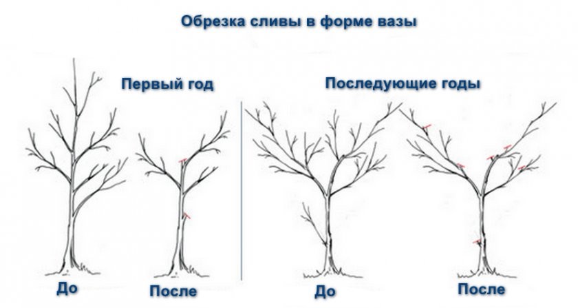 Når du danner en plomme med en bred busk, velges tre skjelettgrener, stammen over den øvre grenen fjernes. I fremtiden øver de på å forkorte grenene.