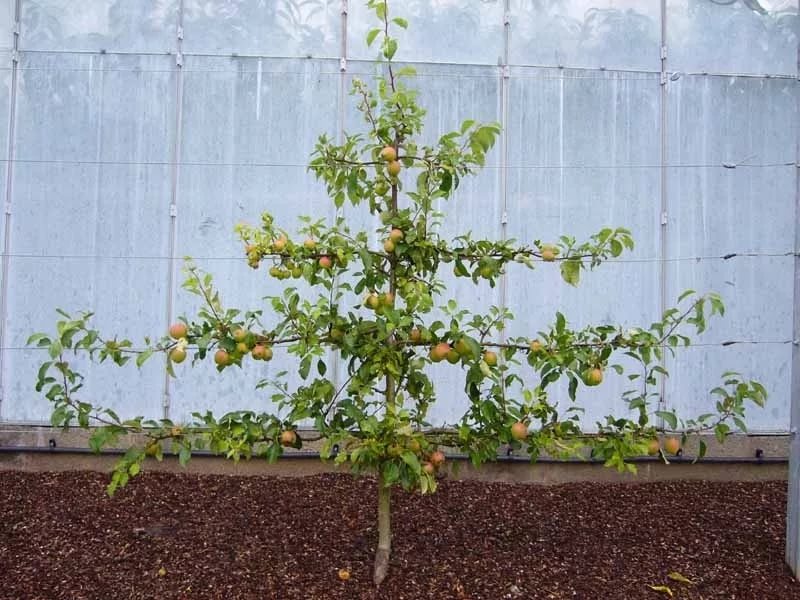 Hele sommeren binder gartnere de øvre grenene og løfter dem litt. To sterke spirer, dannet av høsten fra den øvre stammen til det fremtidige epletreet, etter vårbeskjæring, er bundet til et trellis i en vinkel på 90 grader. De blir den andre raden med krongrener.