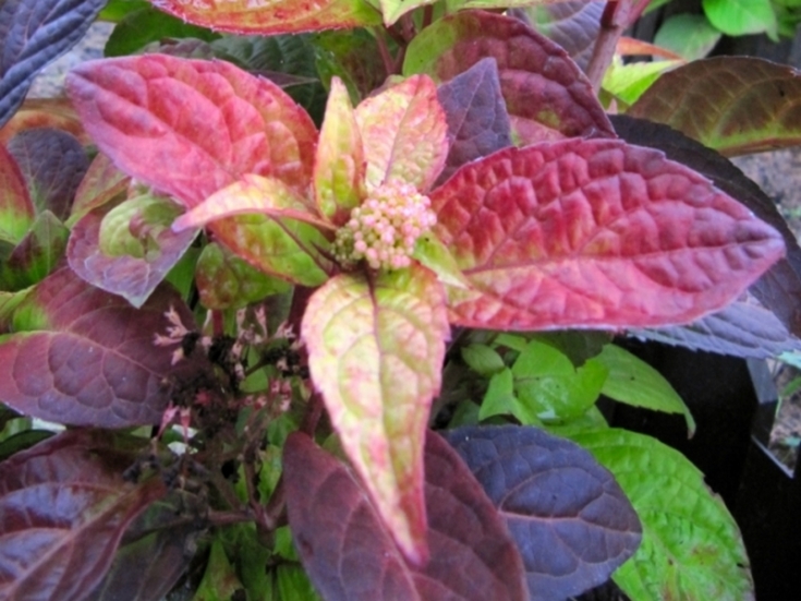 Sterile blomster begynner å blomstre gulgrønne, så blir de rosa og blå, mot høsten får de lilla og burgunderfarger. Løvverket, som på begynnelsen av sommeren har en lysegrønn farge, endrer høsten farge til burgunderrød. Sorten blomstrer vanligvis fra juli til september.