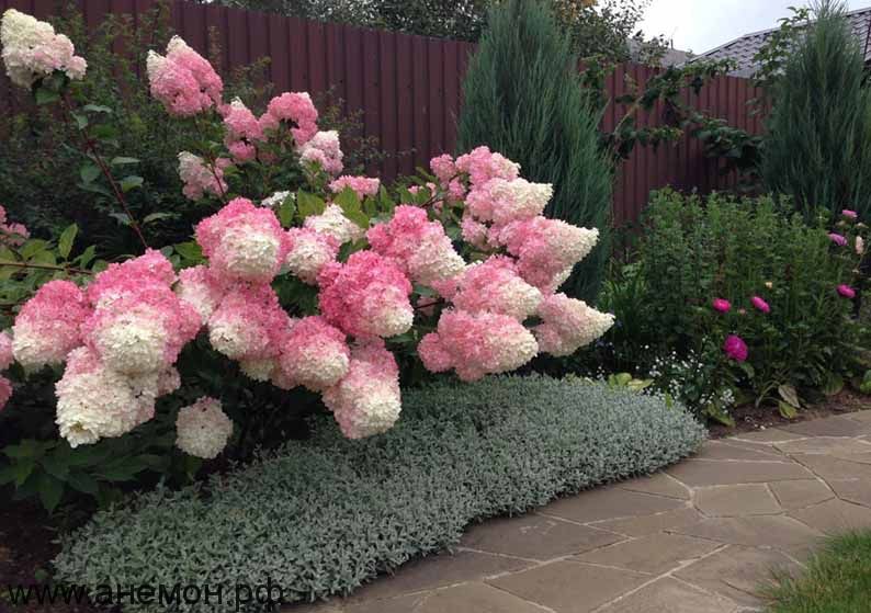 Først blomstrer busken med hvite blomster med en kremskygge, så begynner blomstene å bli dekket av en liten rødme. Nærmere høst blir de rosa, på slutten av blomstringen får de en rød farge, bare på toppen forblir noen blomster kremete. Hortensia vil være duftende til første kulde. For at busken skal blomstre fantastisk, må du følge reglene for å ta vare på planten.