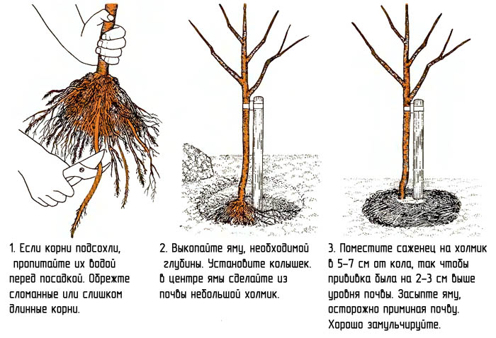 - Plantedybde. Etter plantingen skal plantens rotkrage være minst 5 centimeter over bakkenivå. Dypere treinntrengning fører til langsom vekst og senere frukting.