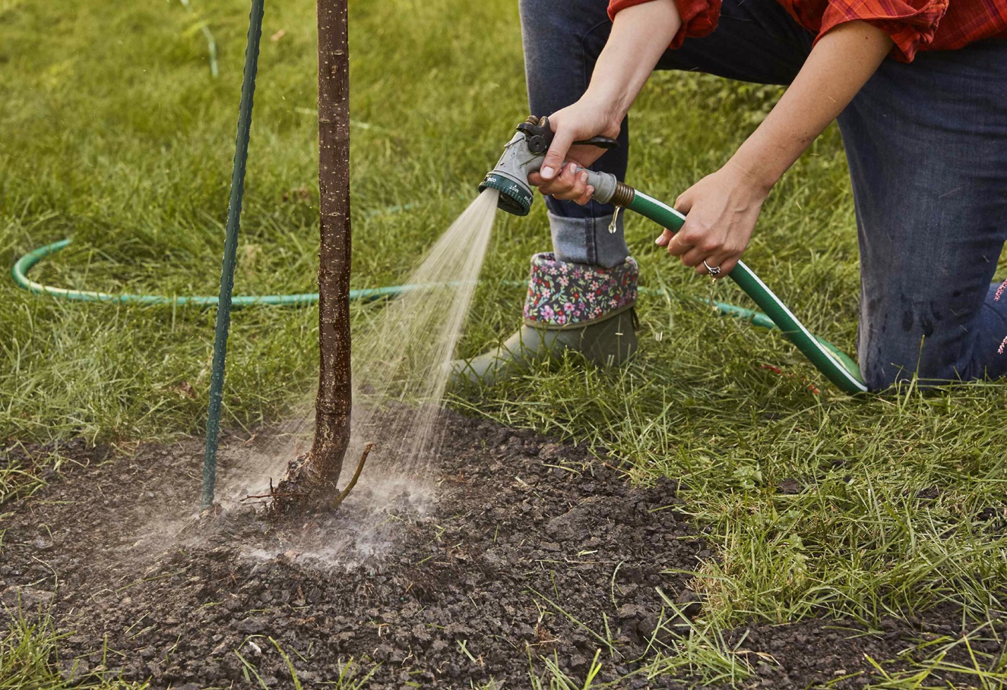 - Treet blir vannet rikelig med varmt vann. Stammesirkelen er mulket. Lagtykkelsen skal ikke overstige 5 centimeter.