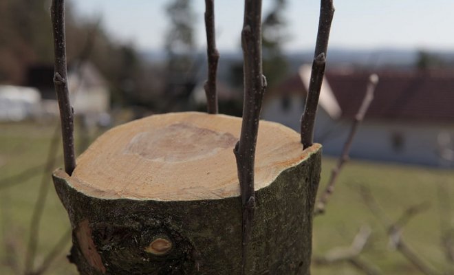 - Fra scion (grenen som skal podes) kuttes den ekstreme knoppen, som nesten er klar til å blomstre. Det er også verdt å fjerne all barken rundt kuttet.