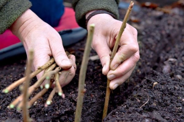 - Bruke rotplanter. Høsting skal utføres før knoppbrudd eller om våren. Den optimale klippehøyden er 15-18 cm. Avstanden mellom beplantning bør ikke være mindre enn 30 cm. Det anbefales å begrave skjærepunktet ikke mer enn 2 cm i bakken. En annen viktig forutsetning for en sunn utvikling av et epletre er jordmaling.