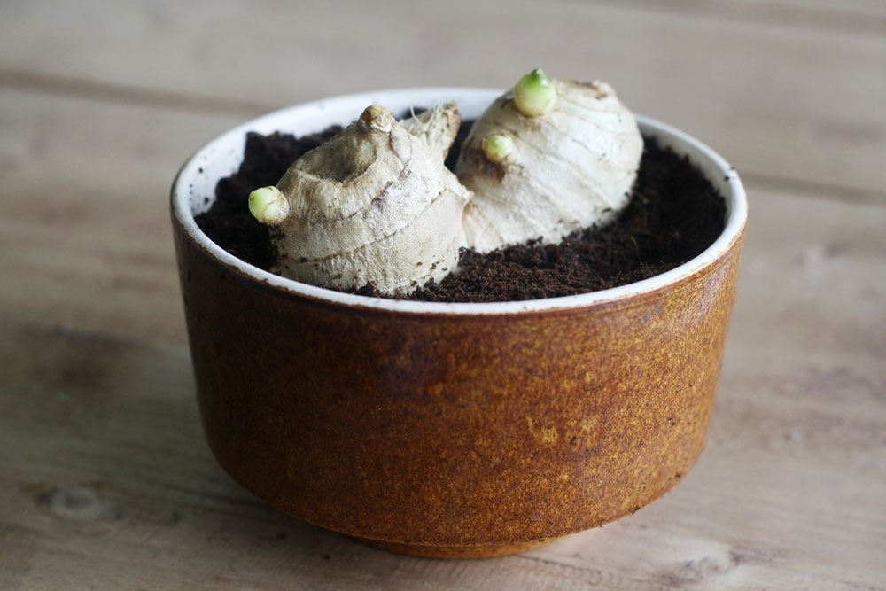 Før du kan dyrke ingefær fra butikken hjemme, må du forberede jorden og potten for planting. Den tilberedte roten må plantes på samme måte som knollene fra hagebutikken.