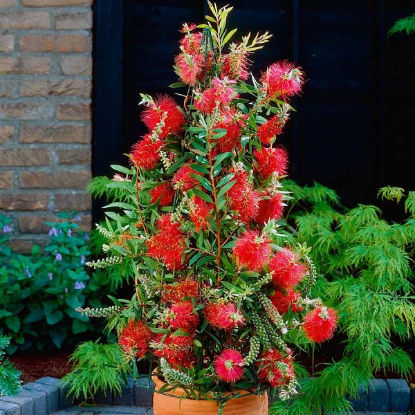- Callistemon rød. En veldig høy busk som ser ut som et tre og når 4 meter i høyden. Røde callistemon-blader er tynne, langstrakte (opptil 7 cm), lyse røde støvdragere med gyldne støvknapper.