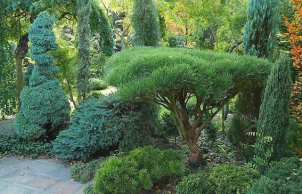 Ofte blir stunted trær brukt i utformingen av sommerhus. Dette kan være fundamentalt nye avlsprøver eller hybrider fra allment kjente planter. En lav dverg vil føre sammensetningen med blomster, utfylle verandaen.
