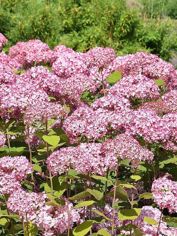 På forsommeren er hortensia-lignende Magical Pinkerbell dekket med store panikulære blomsterstander av en rosa fargetone på sterke stilker. Hvis du ser nøye på børstene, kan du se at ikke-beskrivende små hvitrosa blomster blir hvite ved siden av store sfæriske blomster.