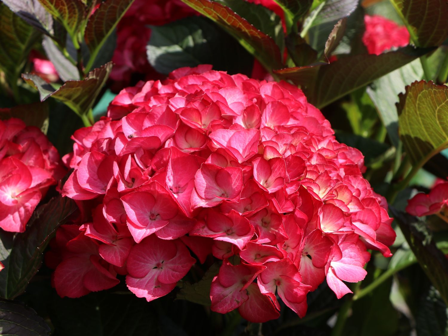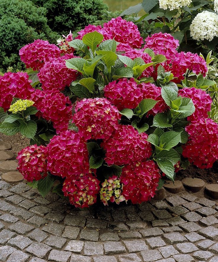 Hortensia-sorten Red Angel ser veldig vakker ut på stedet takket være den edle skyggen av blomsterstandene. Denne varianten er upretensiøs å ta vare på og gir alltid rikelig blomstring.
