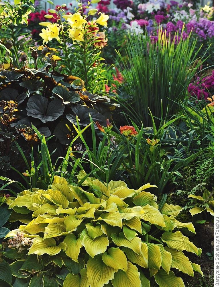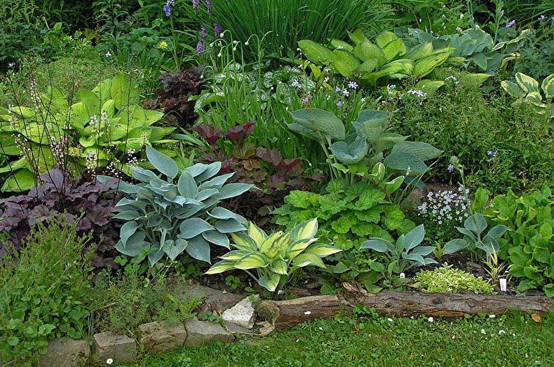 - En blomsterbed med floks, geyhers og verter. En dyktig kombinasjon av Heuchera og Hosta med en oppsiktsvekkende variasjon i nyanser av den ene og den andre blomsten forvandler stedet, det være seg en blomsterbed, plen eller alpinsklie, og tiltrekker seg oppmerksomhet. Begge blomstene er upretensiøse å ta vare på, motstandsdyktige mot sykdommer, frost og tørt vær. Hagehjørner dekorert med Heuchera og Hosta er et virkelig høydepunkt i designet. På et halvskyggefullt område av hagen vil flerårige flokser se ut som et lyspunkt som blomstrer nesten hele sommeren til midten av høsten. Tørre somre, som vinterfrost, er ikke så følsomme for floks.