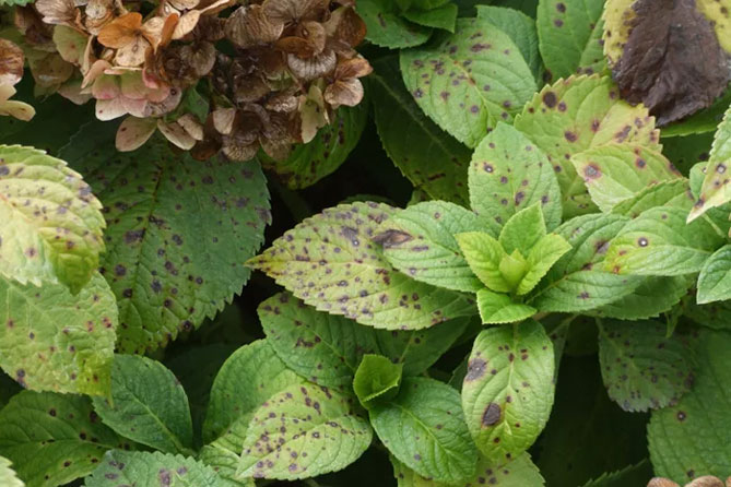 Følgende sykdommer kan føre til rødt løvverk på hortensiabusker: