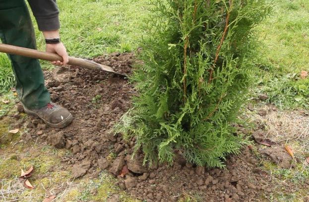 For å sikre full utvikling av thuja, må du forberede en spesiell jordblanding for plantene. For å gjøre dette kan du bruke en blanding av to deler torv eller bladjord og ta en del torv og sand. Når hullet er klargjort, må du helle den resulterende jordblandingen i den.