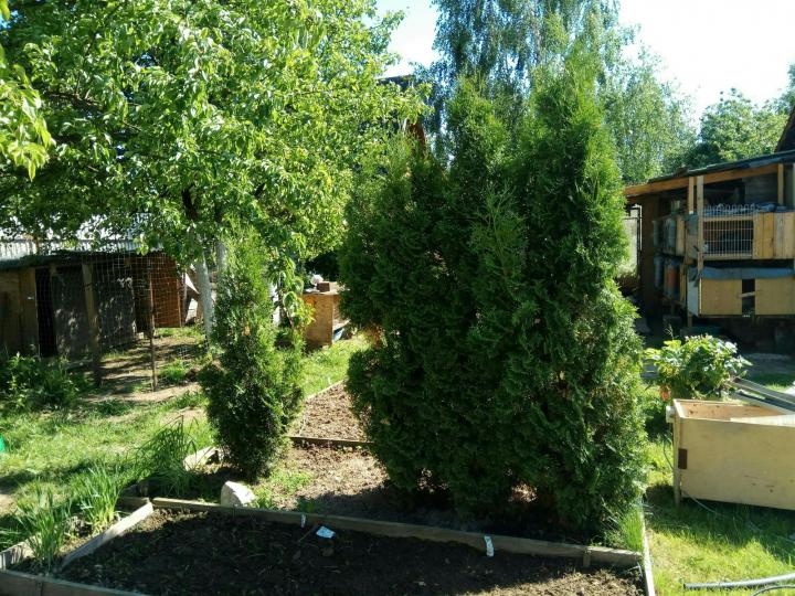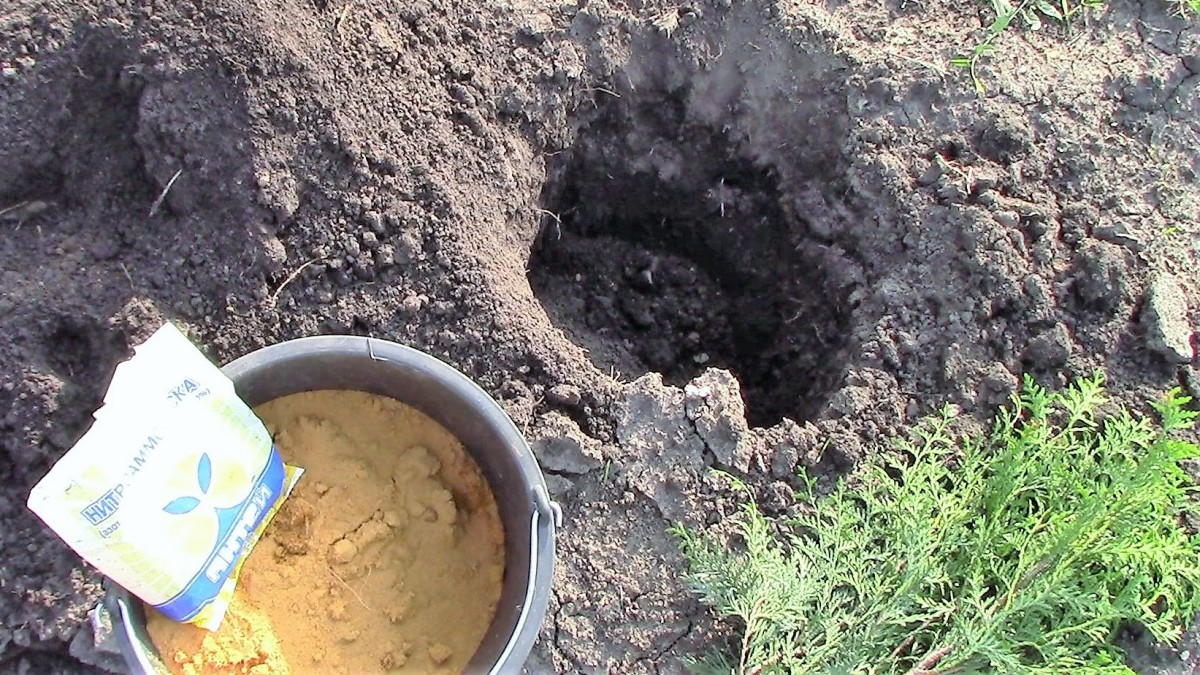- Forbered en grop. Den skal være 10 cm større enn thuja-beholderen. Standardstørrelsen for komfortabel dyrking er 60 × 60 × 80 cm.