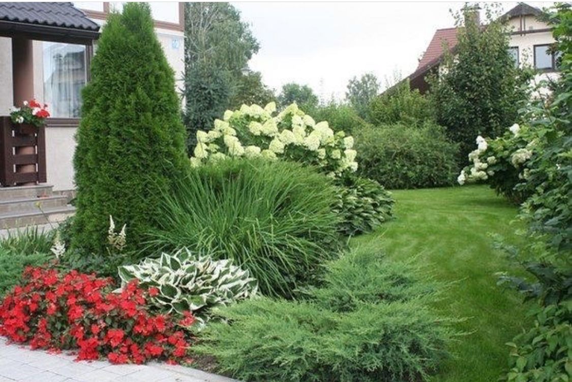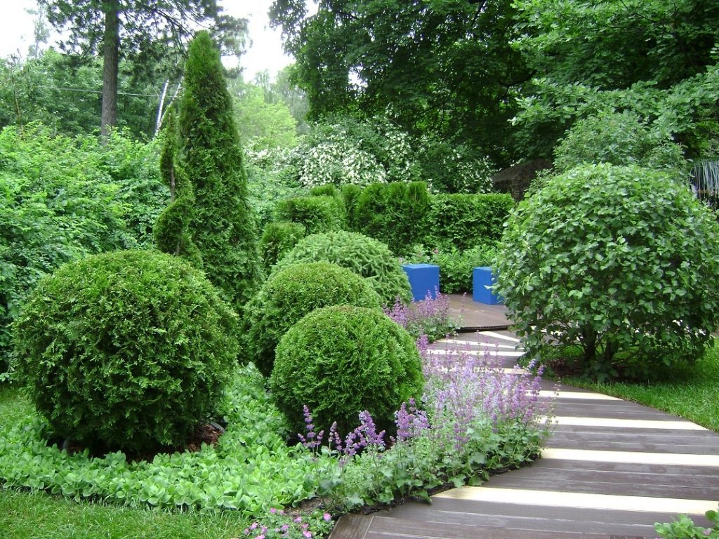 - Excelsa (Thuja Plicata Excelsa) er en annen gigant for komposisjoner i stor skala. Høyden på treet når 12 m, og bredden er 3-4 m. De buede grenene danner en bred søyleform av treet. Den blanke overflaten på de mørkegrønne nålene gjør at den skiller seg ut fra andre eviggrønne.