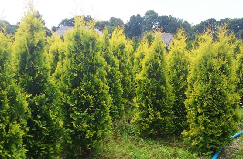 For å skape en thuja-hekk plantes de i en flat linje i en avstand på 0,5 m fra hverandre (avhengig av sorten)