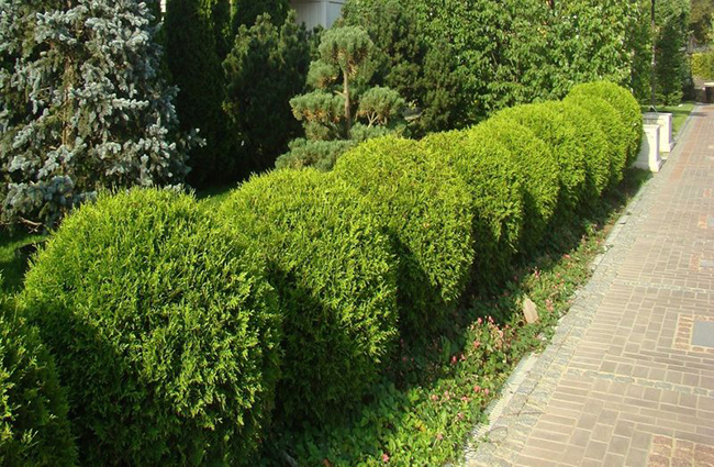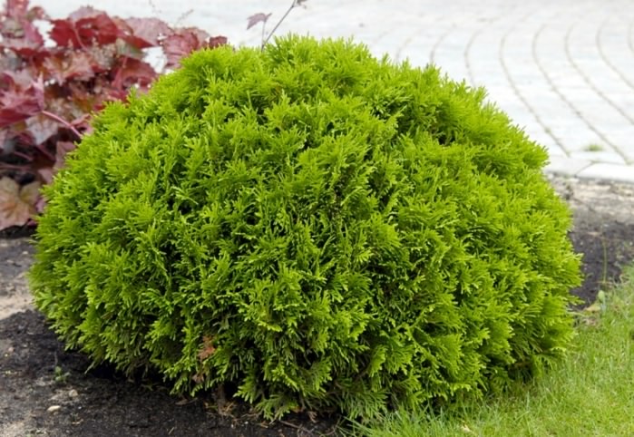 Ofte kombineres sfæriske busker med Bodhi thuja, hvis beskrivelse bekrefter upretensiøsiteten til barrplantasjen og dens utsøkte utseende. Alle har råd til å dekorere hagen sin med slike planter.
