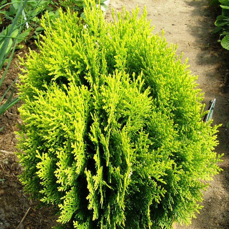 Thuya Aurea Nana, hvis beskrivelse og dimensjoner tilsvarer dvergformen, når en høyde på mindre enn 2 m. Tette nåler tar gyldne fargetoner om sommeren og blir turkise om vinteren.