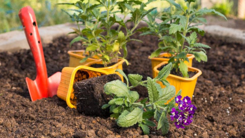 Verbena liker ikke stagnasjon av fuktighet ved røttene, og derfor blir det arrangert et dreneringslag av utvidet leire eller pukk når det transplanteres i åpent underlag. Ellers vil rotsystemet råtne. For å oppnå vakre og voluminøse busker transplanteres planter i 5-7 stykker. i ett hull med en avstand på minst 30 cm mellom dem.