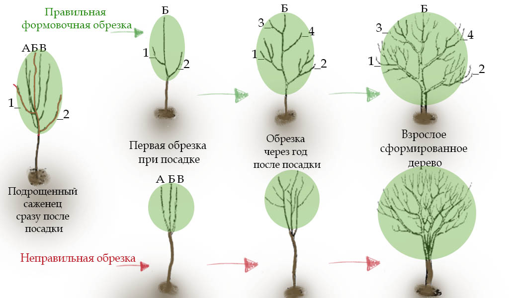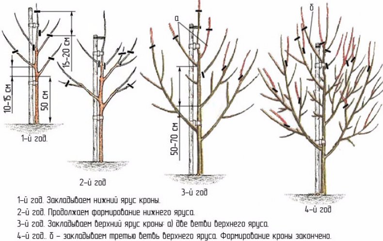 Beskjæring i det andre og tredje året av treets liv utføres i henhold til samme ordning. Fra sidegrenene, som allerede er ett år gamle, begynner grener av andre orden å vokse. Skudd som vokser i rommet mellom lagene kappes og overføres til tre. Etter legging av skjelettgrenene er det nødvendig å trimme den sentrale lederen, som også vil bli overført til sidegrenen.