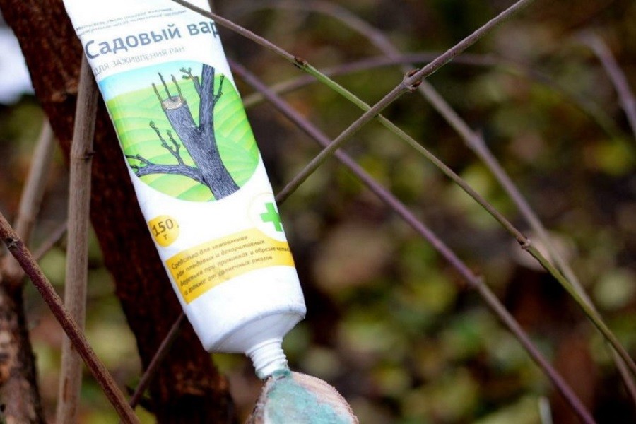 Også i prosessen kan en trappetrinn være nyttig for å trimme den apikale delen. I en hagebøyle kan du legge til planterester, fallne blader. Og hageplassen hjelper til med å dekke over kuttstedene slik at infeksjoner ikke kan trenge inn i det bare såret. Du kan også bruke en leire talker som kitt. Den er laget av leire, vann og halm. Den samme effekten tilveiebringes av en sementmørtel blandet med sand, tørkeolje og en liten mengde vann.