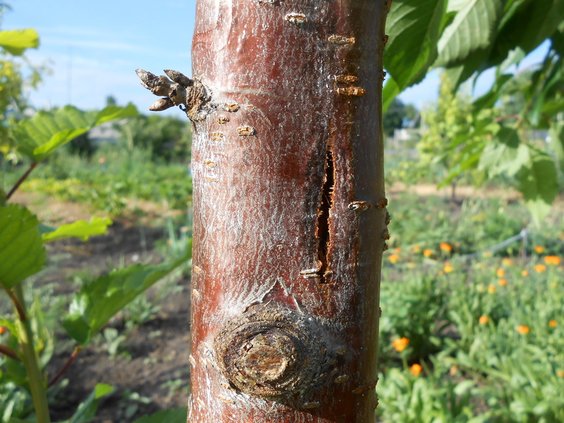 - Hvis barken har sprukket på grunn av frost, bør den dekkes med hagehøyde eller leire.