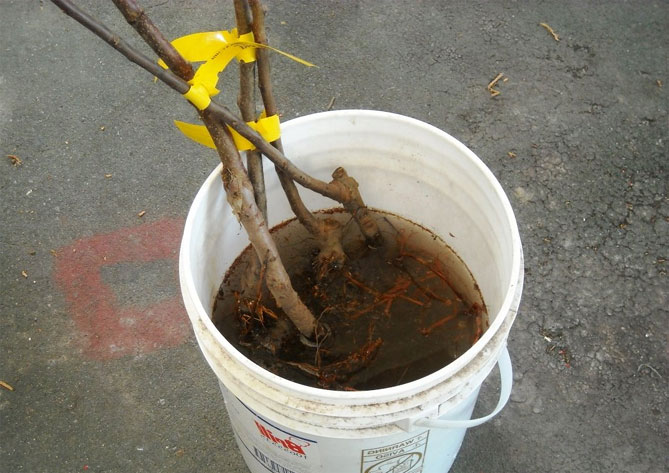 - Soaking røtter. For å dyrke et sunt tre, må du suge røttene i vann før du planter. Denne prosedyren forbedrer overlevelsesgraden til frøplanten etter planting.