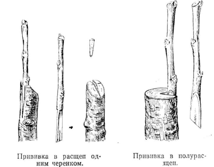 Tykkelsen på scion-stiklingene tas i dette tilfellet mindre enn tykkelsen på grunnstammen. Sistnevnte er kuttet ned til ønsket lengde, hvoretter en splitt opp til ti centimeter dyp blir laget i midten med en øks eller kniv. Grenen av grenen kuttes med en kil, og plasseres deretter i splittelsen av treet. Spaltingsstedet er pakket med folie og behandlet med tonehøyde.