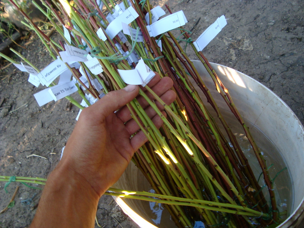 Kileformede stiklinger av aprikos er plassert i disse sporene, og forbinder dermed de nedre og øvre delene av treet. Graftingsprosessen fullføres ved å vikle broen med tape og sparkel med tonehøyde.
