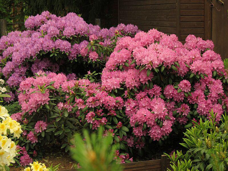 Kjærligheten til delvis skygge lar deg lage hagesammensetninger under trærne, plante avlinger i nærheten, lage grønne eller blomstrende tepper. Rhododendroner ser bra ut langs stier og hekker. De kan fylle hele hjørneområdet i hagen med sine spredte grener.
