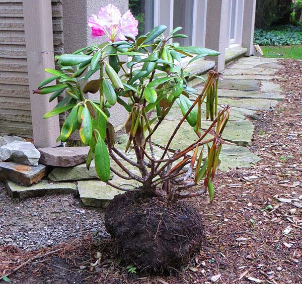 - En annen enkel måte er å dele bushen. En voksen busk frigjør mange skudd fra roten, som er atskilt fra hverandre. Siden røttene til rododendron er veldig skjøre, bør du handle veldig forsiktig og prøve å skade så få røtter som mulig. Når du deler en busk, er det en sjanse for å skade moderplanten.