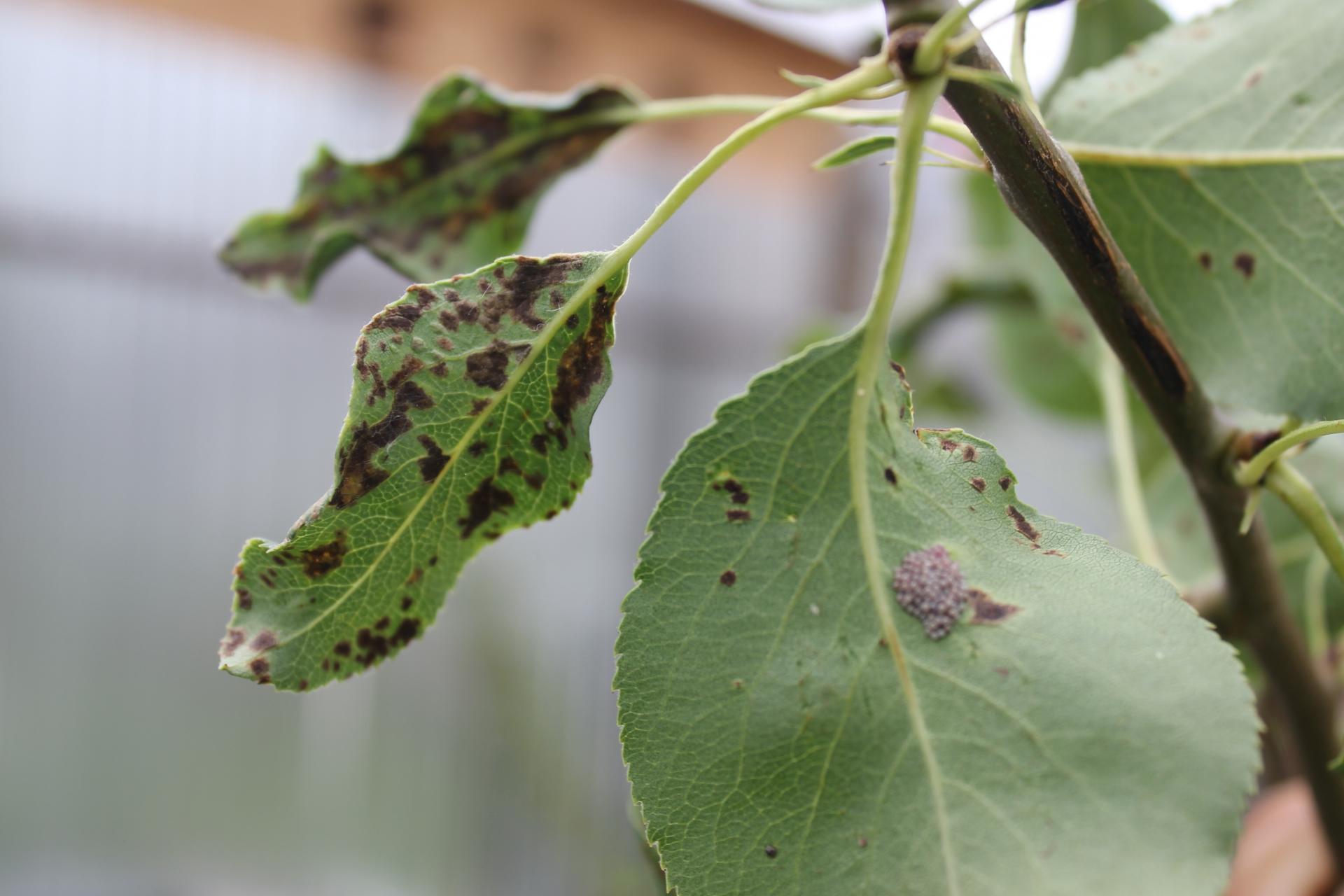 Dette er en vanlig årsak til at pærebladene blir svarte og krøller seg. Tre år gamle frøplanter blir ofte berørt. Patogene mikroorganismer fungerer som forårsakende midler for soppsykdommer. De er i stand til å overvintre vellykket på et passende sted: