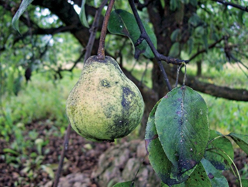 På grunn av denne sykdommen krøller pærebladene seg også og tørker. Infeksjon forekommer oftest i varmt vær med høy luftfuktighet. Unge eggstokker og peduncles begynner å bli mørkere før noe annet. Så skyter, blader er overrasket.