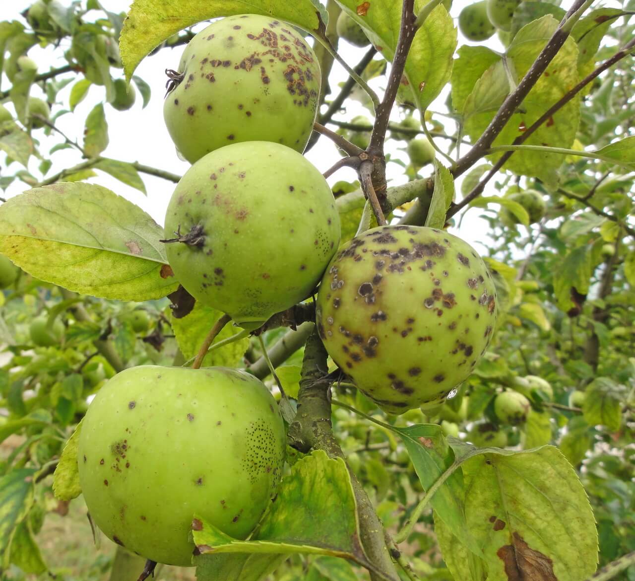 I regnfullt, kaldt vær kan soppinfeksjoner påvirke epletrær. Oftest funnet: skorpe, pulveraktig mugg, rust, moniliose, cytosporose. For å forhindre disse sykdommene er det nødvendig å løsne bakken, regulere vanning, kutte ut gamle og svake skudd, rengjøre stammen av planterester, behandle med Bordeaux væske eller biofungicider gjennom hele vekstsesongen.