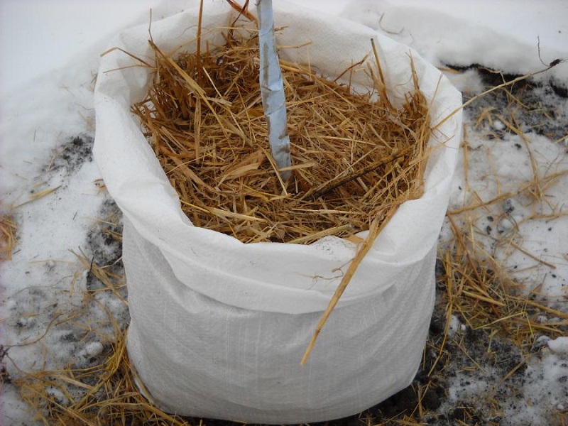 - Pakk treet med flere lag med jute, legg tørt halm mellom dem, fest installasjonen sikkert med et tau.