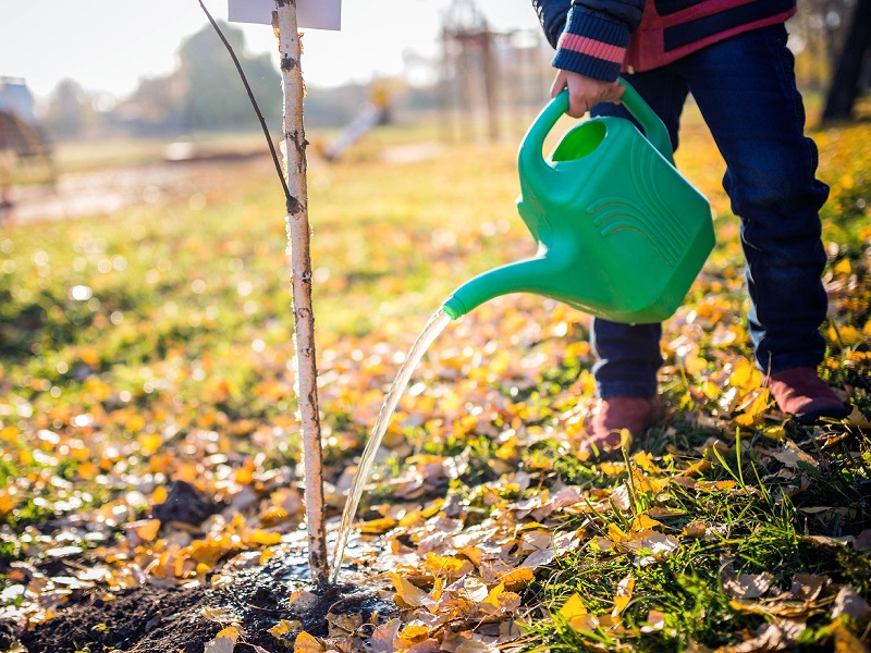 - Komprimerer grundig og fukt jorden i koffersirkelen med 15-20 bøtter med varmt, avgjort vann. For å holde fuktighet i jorden lenger, mulch.