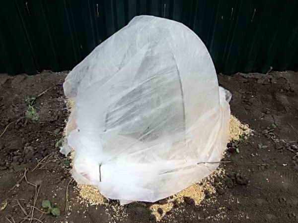 - Hele lengden på planten er pakket inn i en tett klut eller agrofiber. Dekk toppen med en pappeske uten bunn - den vil tjene som beskyttelse mot vinden. Hvis det ikke er noen boks, er planten på 4 sider dekket med ark av papp, fiberplater eller brett. Det indre rommet må dekkes med tørt løvverk eller sagflis;