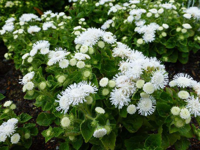 Blomstringene vokser opp til 2 cm i diameter og blir omfangsrike. Takket være dette, så vel som den rikelige blomstringen, ser voksne ageratums ut som frodige hvite baller.