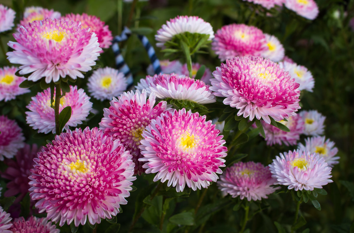 De preges av et stort antall sfæriske blomsterstander. Alena er et mellomstort utvalg av en bringebærrød fargetone. Sen sort Hvit ball, søyle, universal. Erfur-dverg - underdimensjonerte, grense-asters. Princess Mix, Natasha, Anita blir verdsatt.