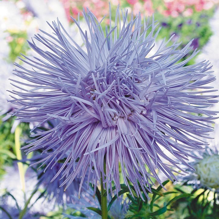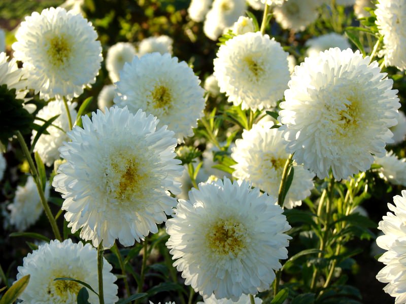 De meter lange stilkene til den hvite aster Symphony er kronet med sfæriske doble blomsterstander opp til 9 cm i diameter. Serotyper "Gala" i forskjellige farger danner en pyramidebusk opptil 80 cm i høyden, tette doble knopper når 12 cm. En annen avl arten er Lady Coral. Skiller seg i farge fra gul aster til mørk lilla. Blomsterstørrelsen er opptil 17 cm.