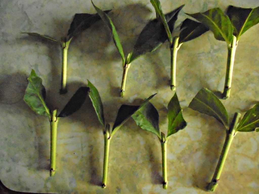 Etter det er stilkene delt inn i deler. Det skal være to knop på hvert segment. Videre er de nedre bladene kappet helt av, og de øvre bladene etterlater halvparten.