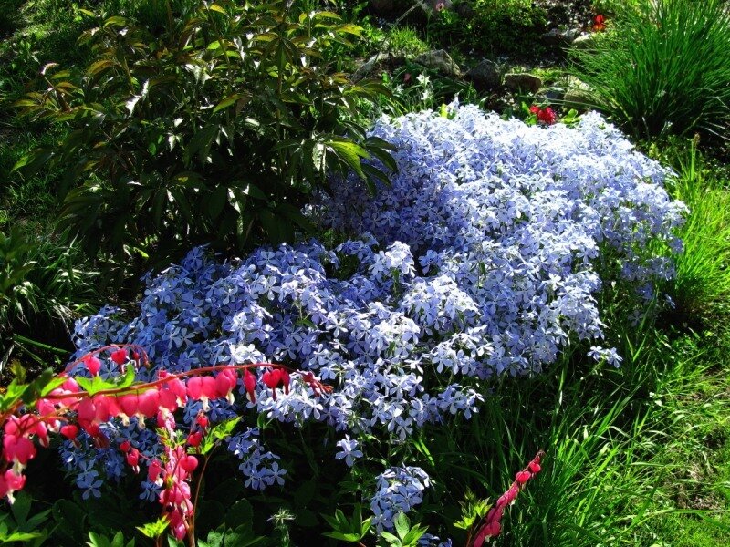 Phlox Widespread er perfekt kombinert i blomsterbed med store tusenfryd, gule eller knallrøde tulipaner, med gjennomgående busker.