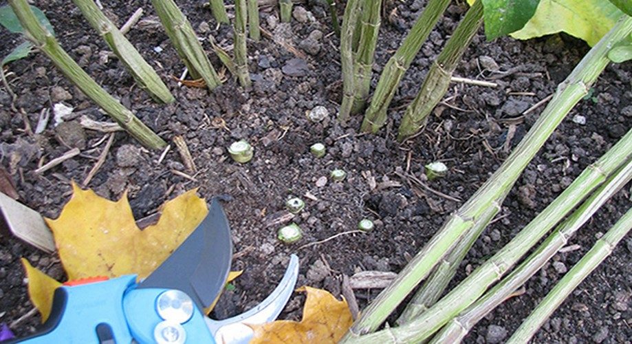 Du må kutte den slik at ca 10 cm over bakken blir igjen fra skuddene. Buskenes base sprayes deretter med et soppdrepende middel.